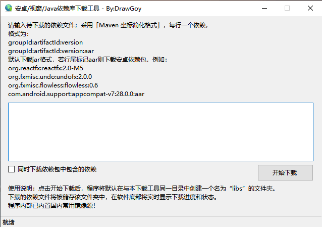 本工具可快速下载基于Java构建的Jar/AAR格式的依赖文件,针对类库封装、原生开发时提供辅助。