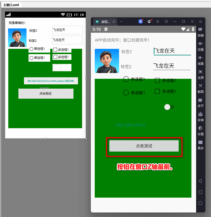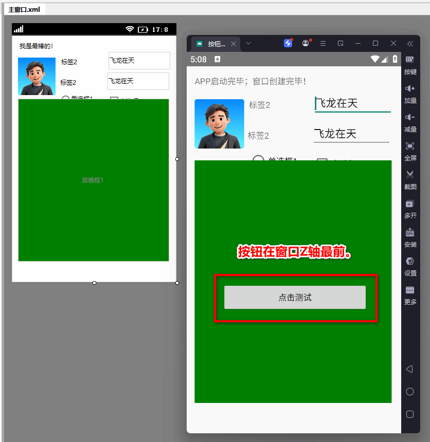 如下图所示,我在最后面给窗口添加了一个大绿颜色的宫格框,运行之后,“点击测试”按钮跑到前面来了。