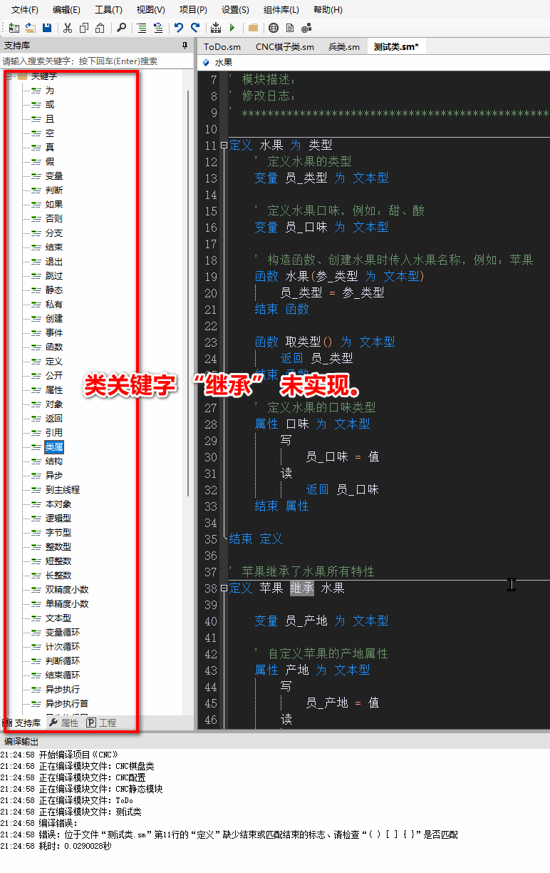 您好,感谢反馈,在轻语言中面向对象和继承等功能在当前的版本还不可用,目前IDE搭载的轻语言版本为 ` 1.5 ` 版本,而面向对象相关功能的支持需要在轻语言 ` 2.0 ` 时才会被提供,在 VcnStudio IDE 4.9 左右时的版本可用。